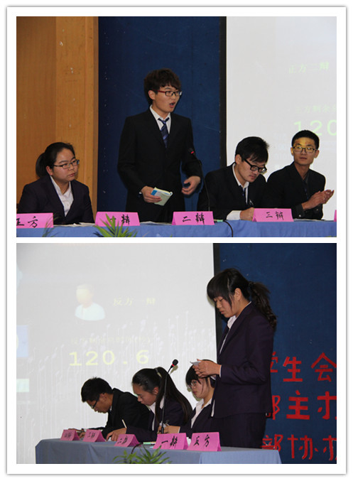 在过去半个月中,十五只队伍经过了初赛、半决赛激烈对抗后,最终13自动331班和12机电332班两只队伍一路上过关斩将,脱颖而出,进入了今天的冠亚军的角逐。今晚的辩题是“结果和过程哪个更重要”,正方是13自动331,反方是13机电632。辩论场上且看辩手机智应变,妙语连珠,唇枪舌箭,字字力争,你来我往,不亦乐乎,双方展开了精彩地辩论。场下观众激情澎湃、掌声连连响起。自由辩论环节将比赛气氛推向高潮,精彩不停,掌声不断。辩论赛接近尾声时,安排了观众提问环节,台下观众热情高涨,所提问题犀利、棘手,但正反双方辩手都能从容应对,十分给力,展现出了他们的智慧与辩才。