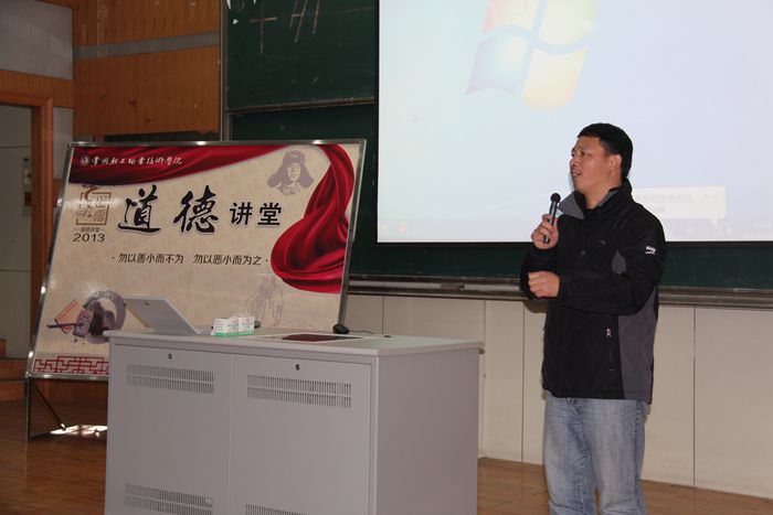 12月19日,电子系在教学楼3101报告厅举行道德讲堂活动。本次道德讲堂由辅导员魏灵水老师主讲,电子系分团委书记韩杨老师主持,13电子331、机电631、632和12自动331等四个班级的同学参加了活动。 魏老师首先介绍了常州市“道德讲堂”活动起源,告诉同学们常州从“三次让国”的季子开始就是一个文明崇礼的城市。接着,魏老师通过文天祥与正气歌、宋代书法四大家中蔡京为什么会被蔡襄取代等几个历史故事告诉同学们中国从历史上就一直以人物的道德来衡量一个人的气节与成就。魏老师还从发生在电子系老师和员工身边的两件事,讲述了宋朝晖老师爱护员工和张欣欣拾金不昧的故事。最后,魏老师向同学们推荐了路遥的小说《平凡的世界》,希望同学们懂得生活对每个人都是公平的,只要努力就会有收获。 电子系党总支高度重视员工德育工作,坚持用“道德讲堂”这个平台对员工进行教育,收到了较好的效果。