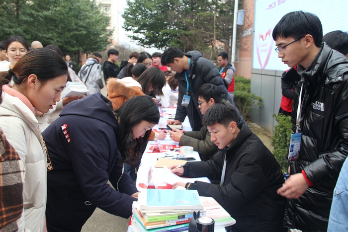 公寓区里,同学们呼朋引伴,前来捐书的人络绎不绝。有的志愿者负责维持现场秩序,有的志愿者们忙着登记前来捐书的同学信息,有的志愿者则将收到的书整齐堆放在一起,大家互相配合,有条不紊。捐书活动持续到当天下午5点,有近八百名同学参与。