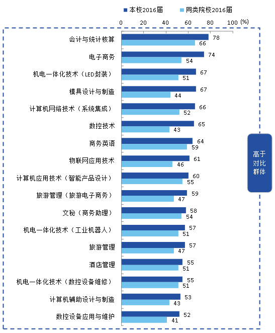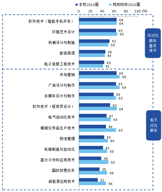 本校2016届工作与专业相关度较高的专业是会计与统计核算(78%)、电子商务(74%),工作与专业相关度较低的专业是新能源应用技术(32%)、国际贸易实务(35%)、高分子材料应用技术(38%)。