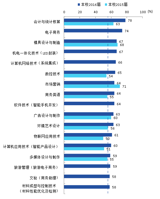 本校2016届毕业生的工作与专业相关度为56%,比本校2015届(53%)高3个百分点,比全国高职2016届(62%)低6个百分点。