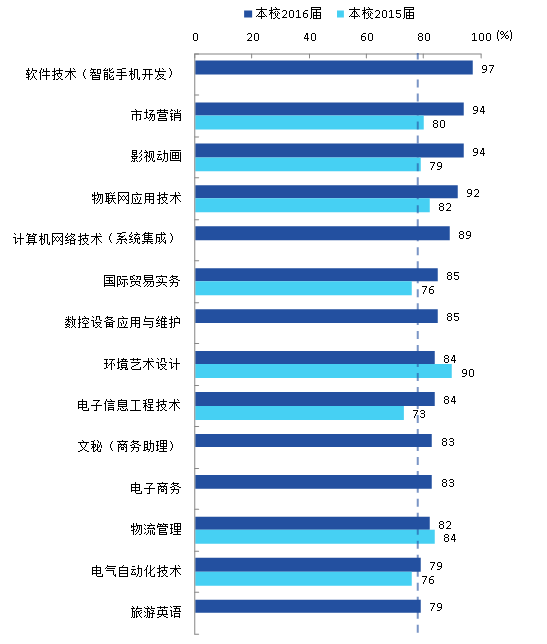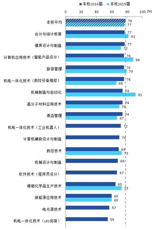 本校2016届就业现状满意度较高的专业是软件技术(智能手机开发)(97%)、市场营销(94%)、影视动画(94%),就业现状满意度较低的专业是机电一体化技术(LED封装)(55%)、电光源技术(57%)、新能源应用技术(60%)。