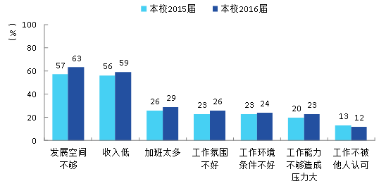 本校2016届毕业生对就业现状不满意的最主要原因是“发展空间不够”(63%),其次是“收入低”(59%)。