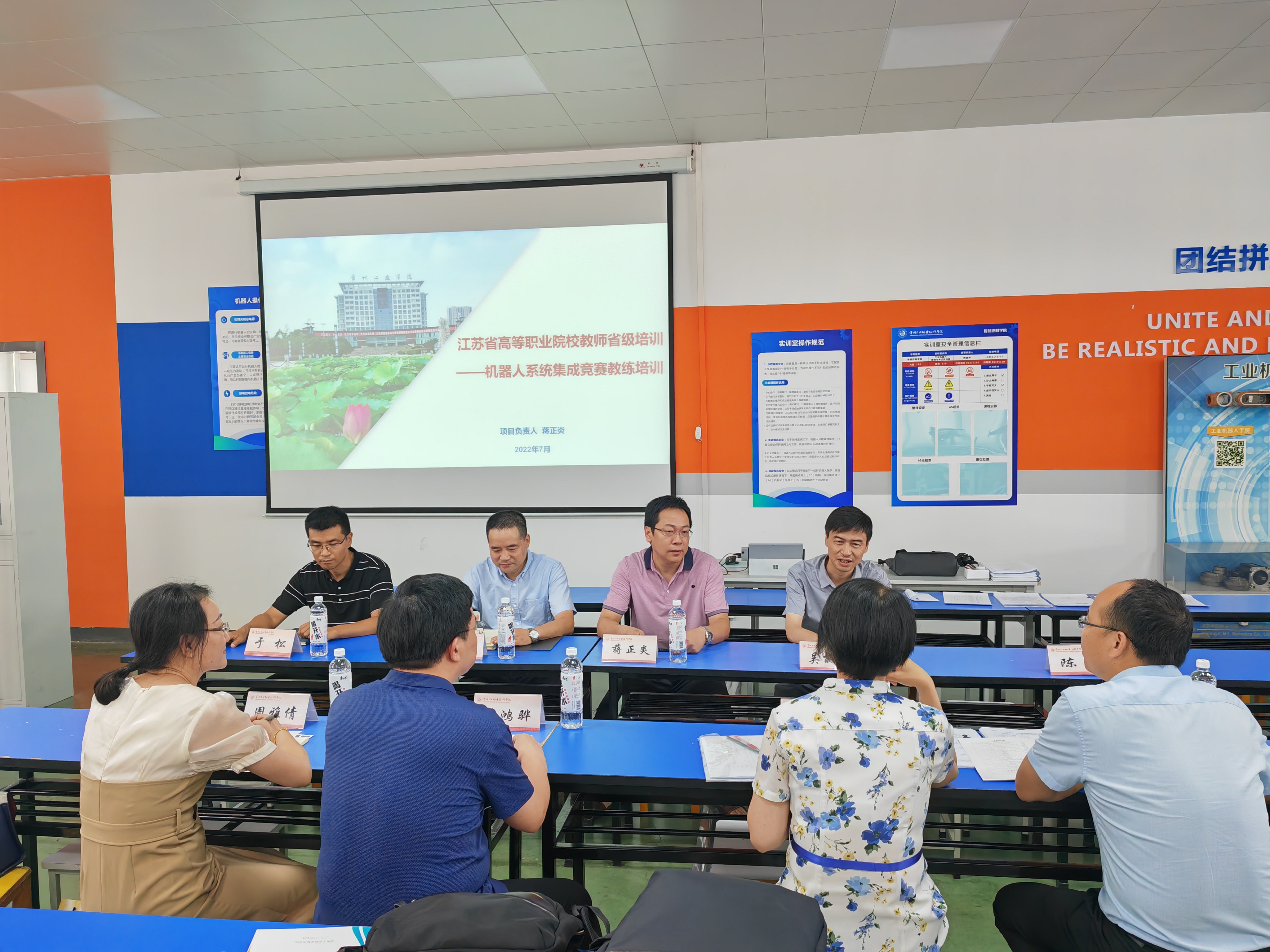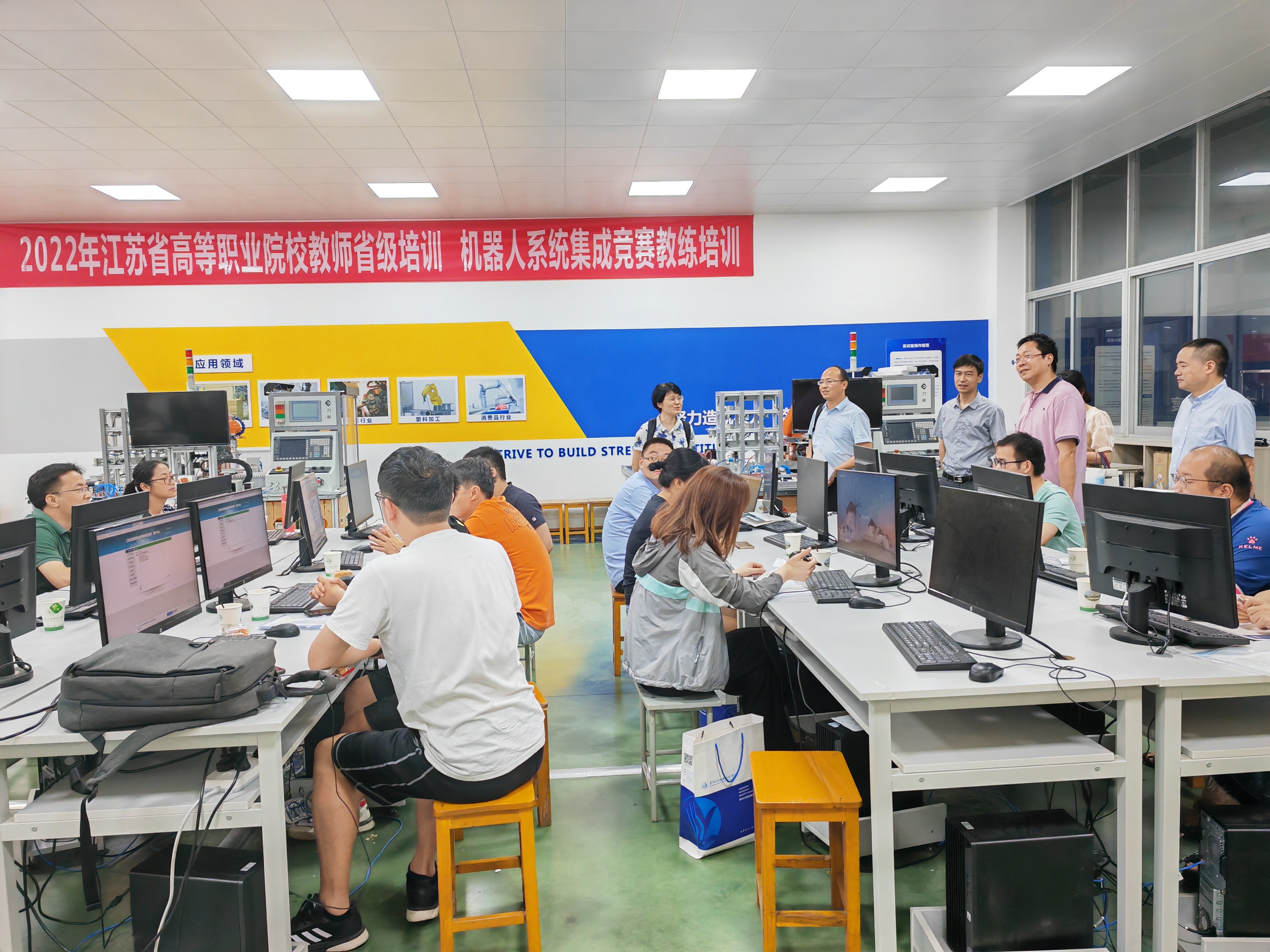 为进一步加强培训管理,提高培训质量,及时总结培训经验,7月22日,江苏省教育厅教师工作处处长徐萍,中职教师培训中心主任曹鸿骅,高职师培中心主任聂伟进,高职师培中心国培项目主任周雅倩莅临公司调研“机器人系统集成竞赛教练培训”项目实施情况。副董事长吴丽云,太阳集团tcy8722经理蒋正炎陪同调研。