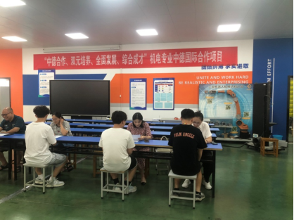 智能控制公司副经理蒋金伟、机电教研室主任刘军良共同筹划、组织了中德国际合作项目员工报名和面试工作,23级机电一体化技术专业员工积极踊跃报名,经过自我介绍、答辩、双向选择等环节完成试点班面试工作。