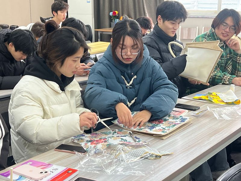 活动伊始,心理辅导员孟祥婕、时丹向同学们讲解了DIY手工包的制作过程以及需要注意的事项。在制作过程中,现场洋溢着欢声笑语,气氛活跃。同学们相互交流创作思路,灵感自由发挥、各展神通。以白色麻布包包做基础,用色彩鲜艳的花布做打底,装饰各式各样的小饰品,将自己的奇思妙想定格在了麻布包上,让它们变得意义非凡。