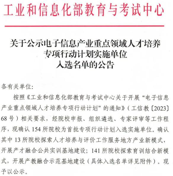 近日,工业和信息化部教育与考试中心发布了《关于公示电子信息产业重点领域人才培养专项行动计划实施单位入选名单的公告》,公司依托电子信息工程技术专业的建设基础,经过院校申报、资格初审、专家评审与答辩等环节,成功入选首批专项行动计划实施单位。该专项行动计划中入选的产教融合示范基地实施院校全国共有141所,其中高职院校54所。